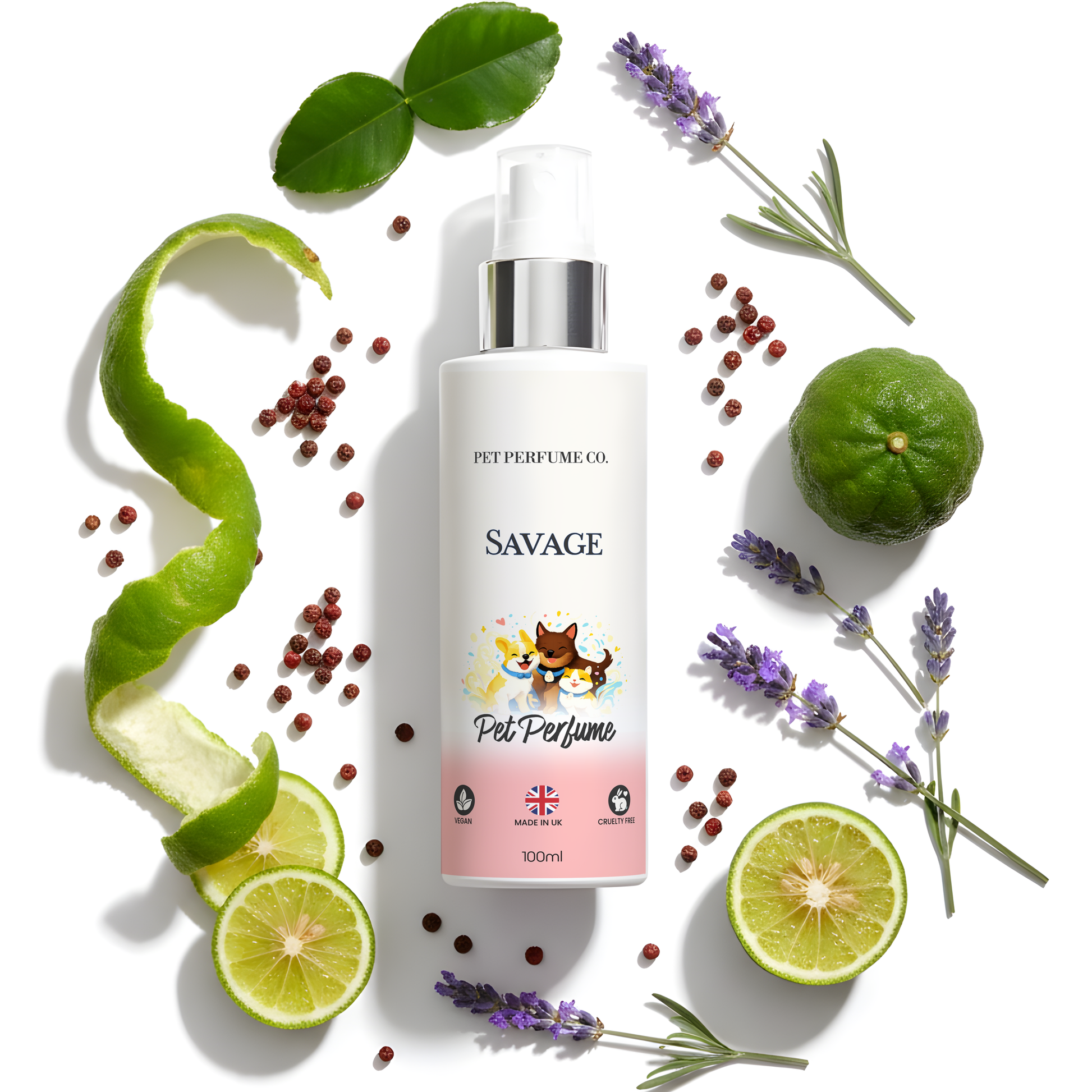 Our Savage Pet Perfume is a bold scent, inspired by wide-open, untameable landscapes. It opens with the vibrant freshness of bergamot combining with aromatic spice, and woody notes. A fragrance that embodies strength, freedom, and raw sophistication.